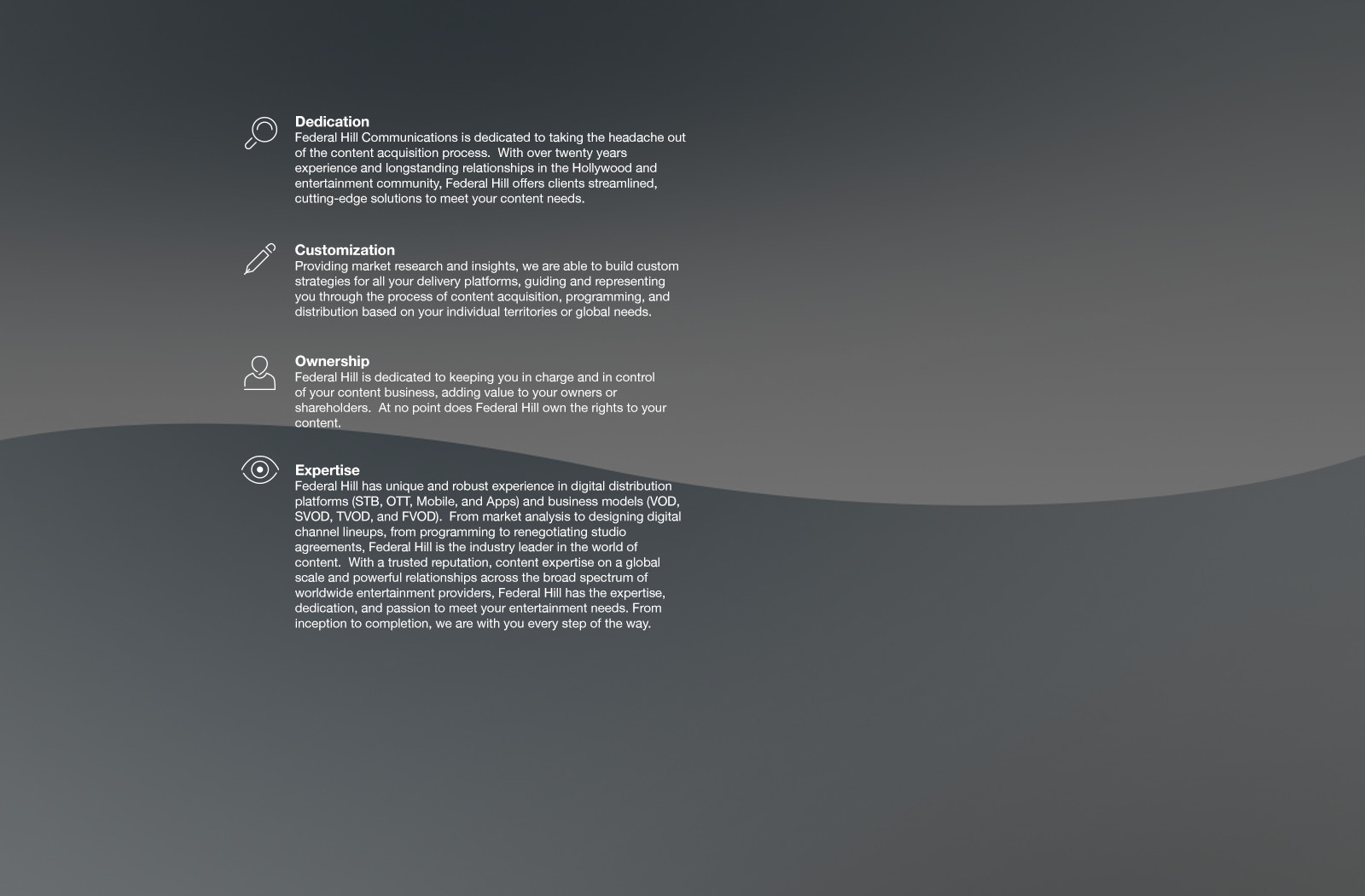 For over twenty years, Federal Hill Communications has been at the forefront of digital entertainment and worldwide distribution. By offering customized content strategies and licensing distribution services, Federal Hill has become the industries' most powerful content advisory firms across TV, broadband, and mobile platforms.